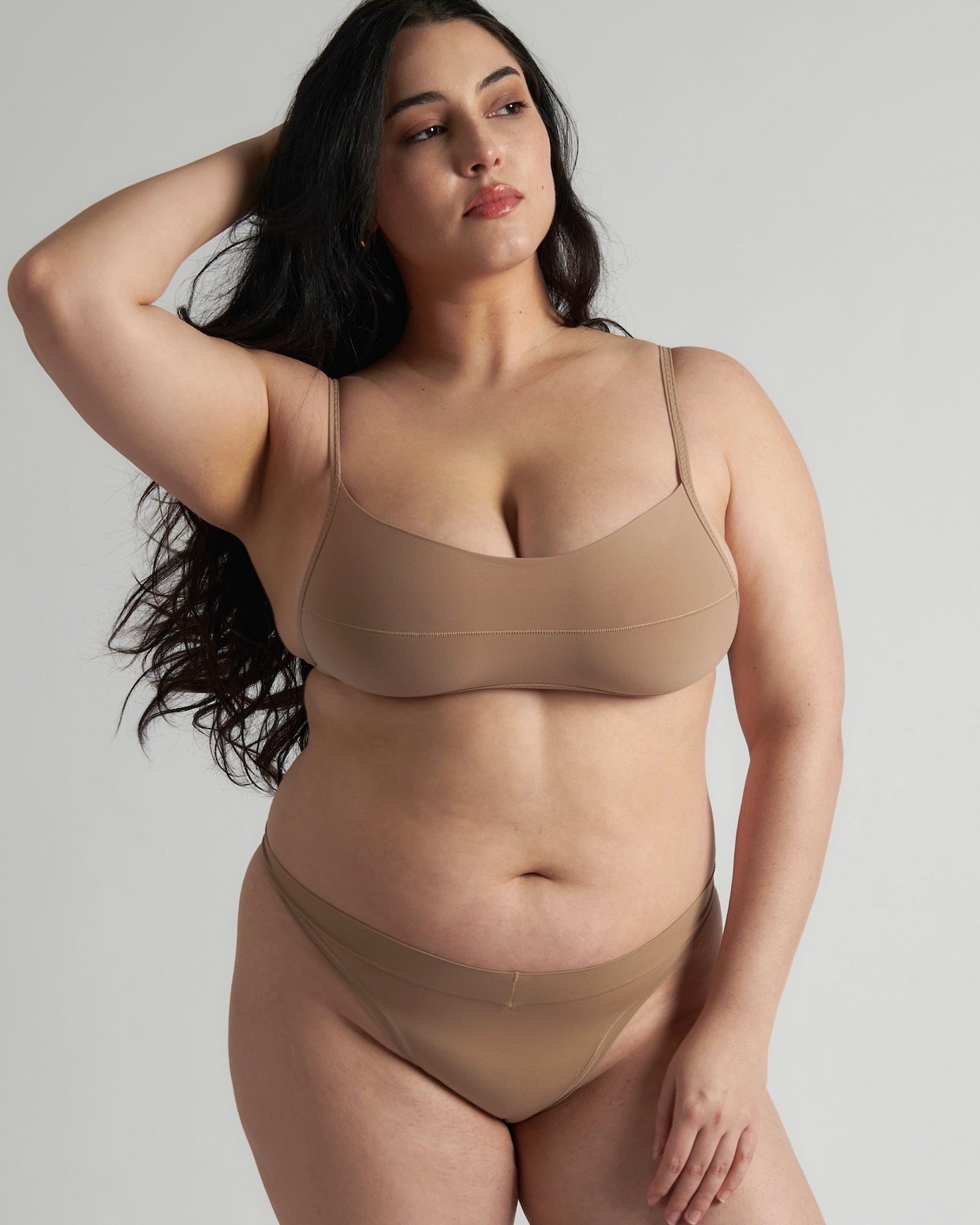 A person wearing a minimalistic beige bra with thin straps, designed in the U.S. and made in Turkey.