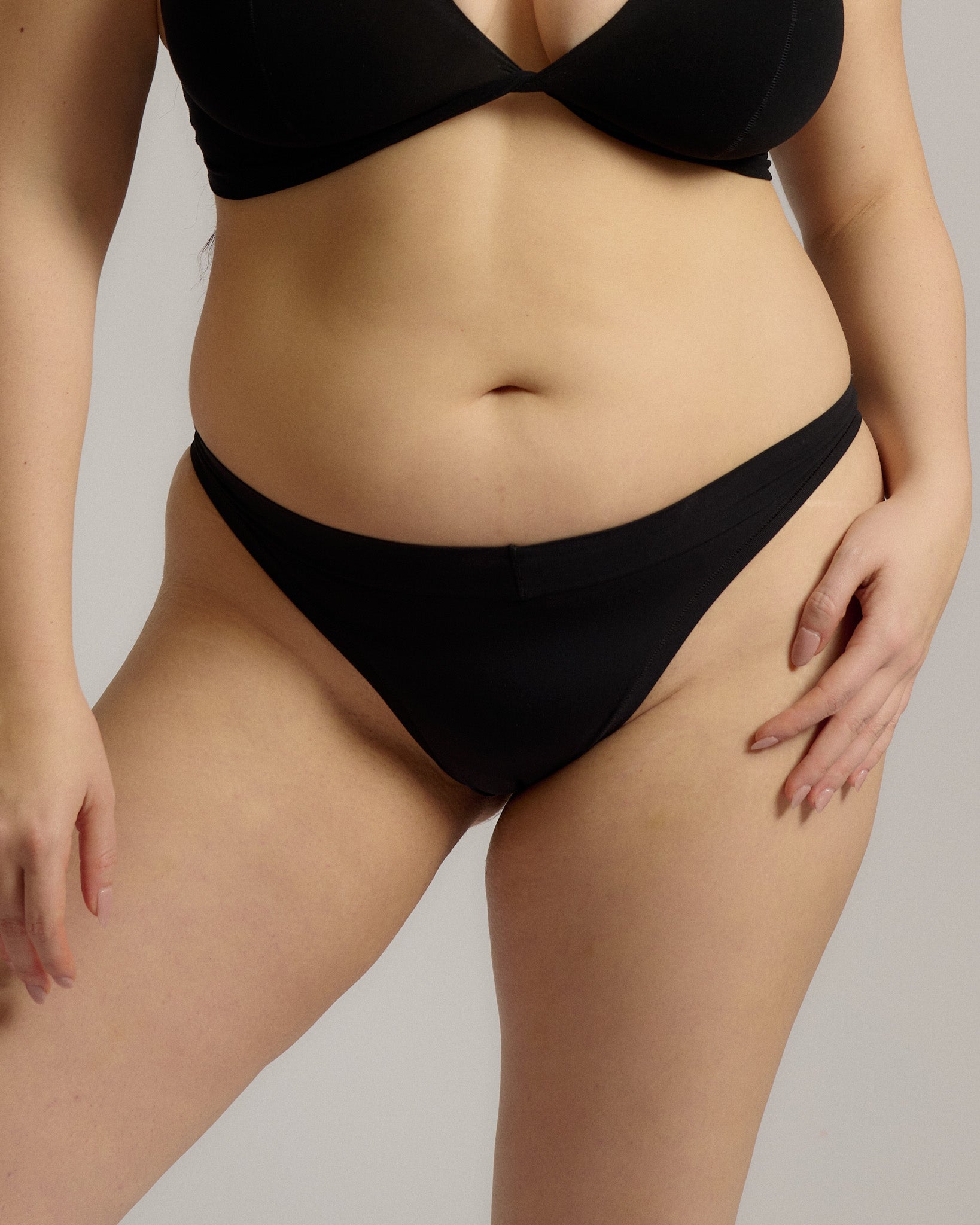 A woman wearing black thong underwear designed with a mid-rise cut.