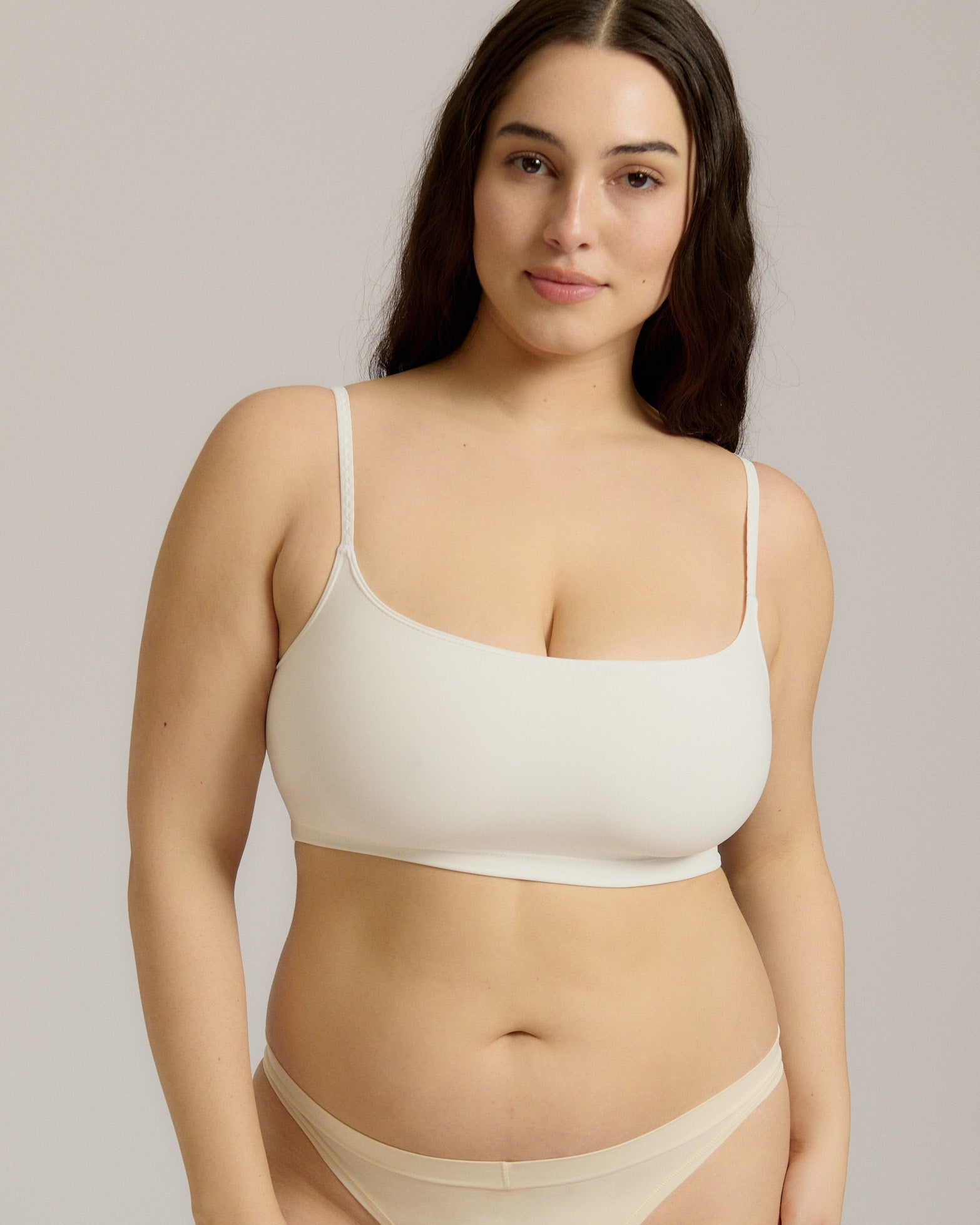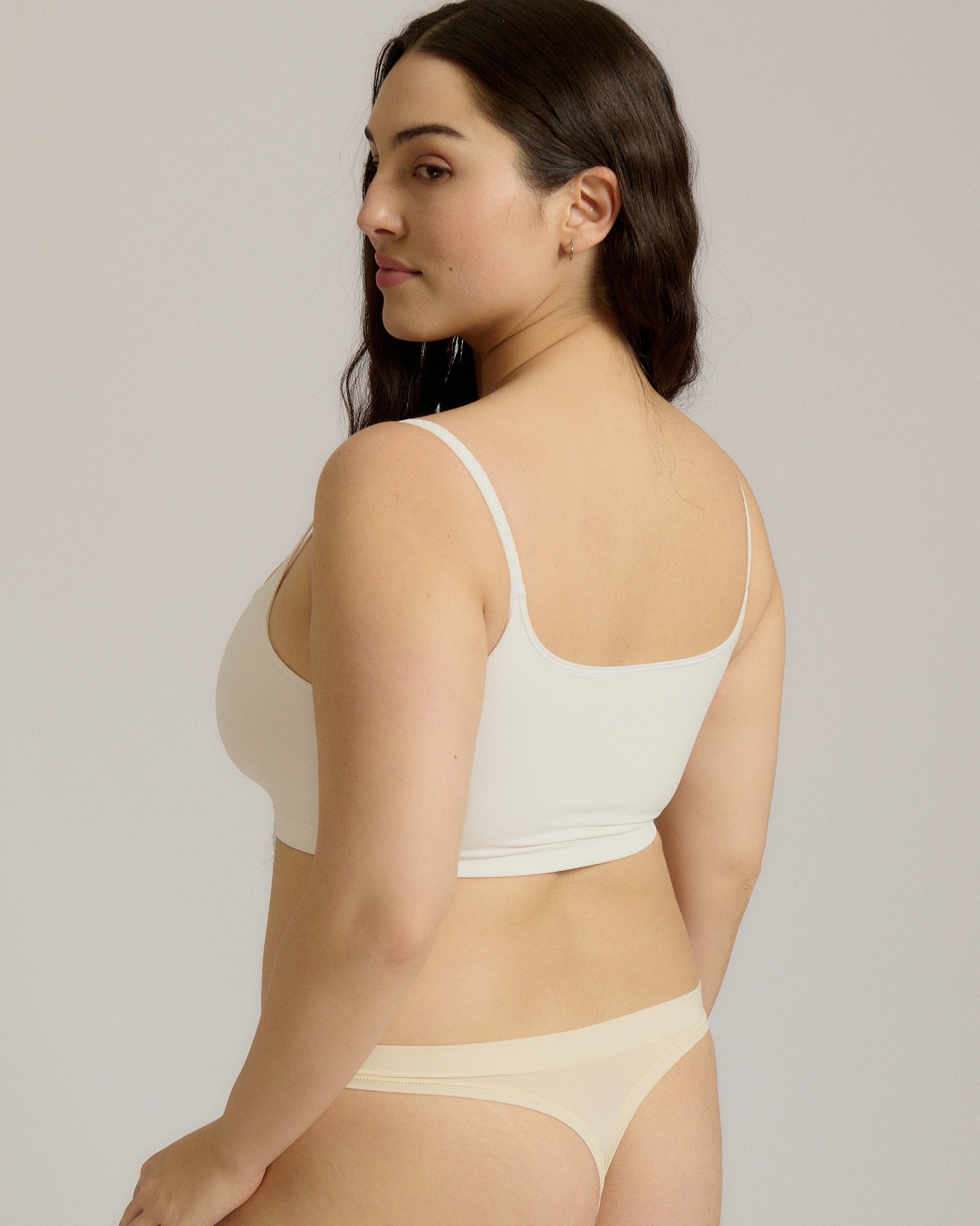 Woman wearing a white cropped cami on a plain background