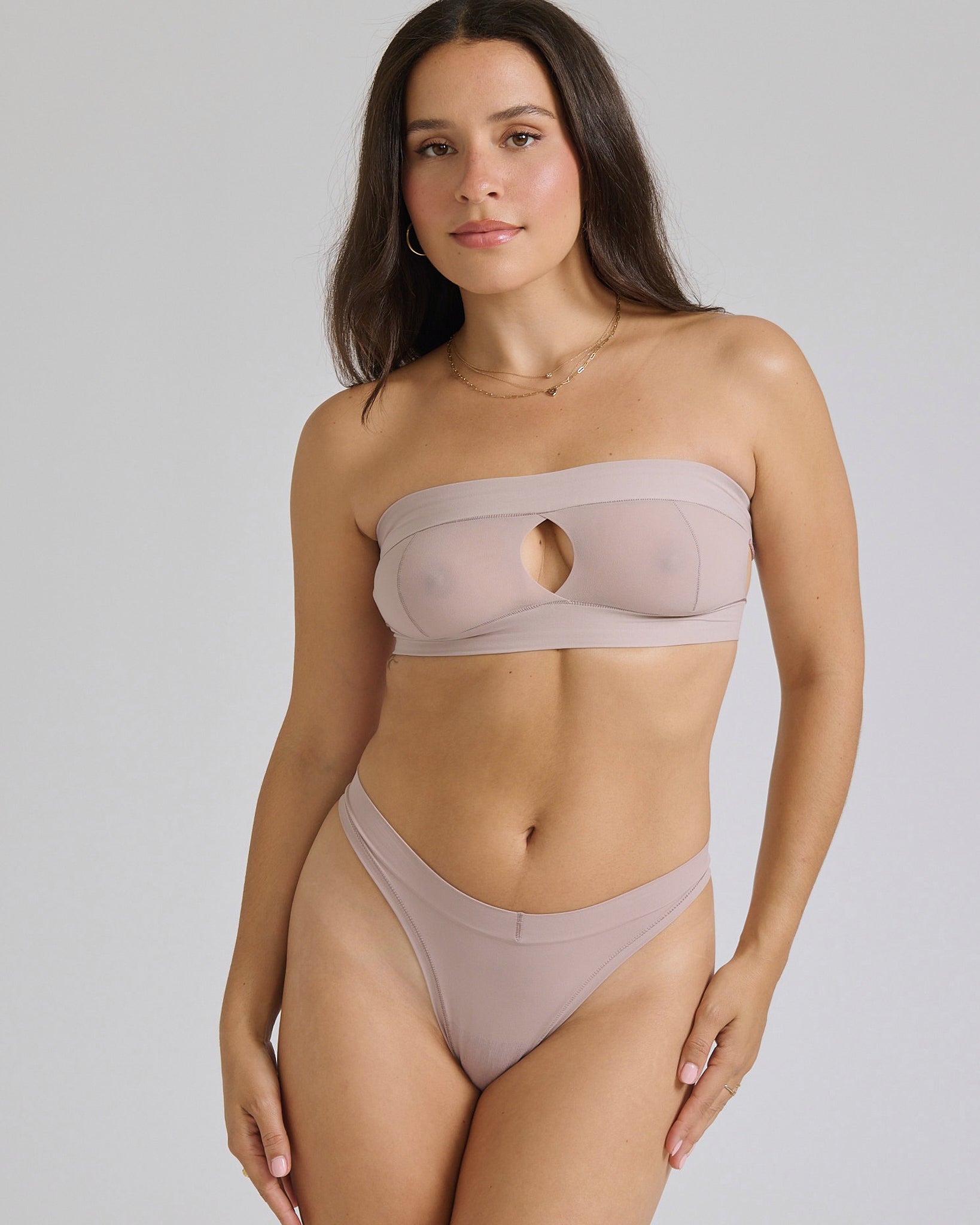 woman wearing dusk strapless system on neutral background